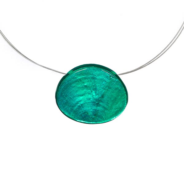Material: Anhänger aus Capizmuschel (Placuna placenta) mit Kunstharz überzogen; Kette und Verschluss aus Edelstahl, nickelfrei