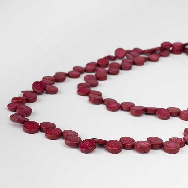 Herbstliche ENDLOS-Halskette ohne Verschluss, aber mit vielen weinroten Perlen aus der Kokosnuss-Schale.