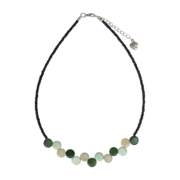 Leichte Halskette mit schwarzen Glasperlchen und Kokos-Perlen in frischen Grün- und Erdtönen.