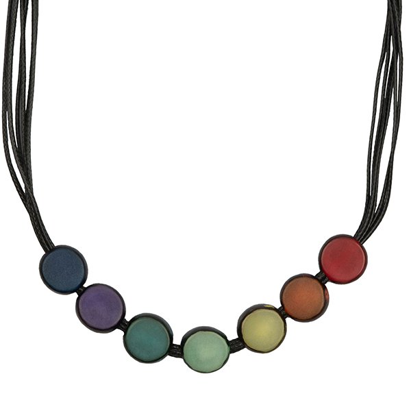 Einreihige, leichte Halskette mit einem Regenbogen Farbverlauf- ein tolles Pride Statement Schmuckstück! Die Nuss Scheibchen stammen von der philippinischen Buri-Palme.