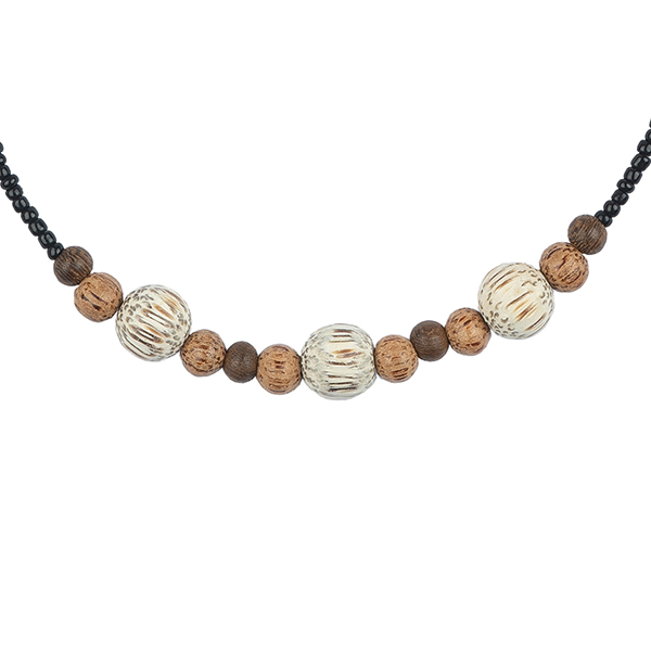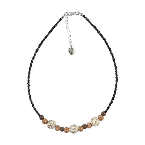 Einreihige Halskette mit schwarzen Glasperlchen und Buri Nüssen in natürlichen Erdtönen.