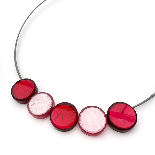 Eine Halskette zum Verlieben - in zwei lieblichen Rottönen. Die fünf Anhänger werden aus den Schalen der Capizmuschel hergestellt. Das äußerst robuste Muschelmaterial verbunden mit dem lichtdurchlässigen Kunstharz, ist in seiner Wirkung dem Schimmern der Muscheln im Meer nachempfunden. Sie wachsen in den seichten Küstengewässern rund um die philippinischen Inseln. Unser langjähriger Handelspartner SHINE verwendet ausschließlich die Schalen bereits abgestorbener Muscheln, die am Strand der Insel Cebu eingesammelt werden.