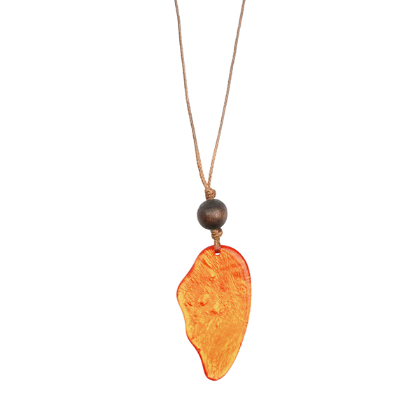 Material: Anhänger aus Capizmuschel (Placuna placenta) mit Kunstharz überzogen, Holzperlen, verstellbar über Schiebeknoten