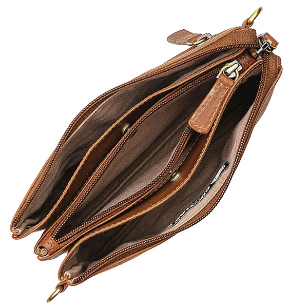 Innen: graues Baumwollfutter, drei Abteile, davon das mittlere zusätzlich mit Reißverschluss zu schließen, Kreditkarteneinsatz.