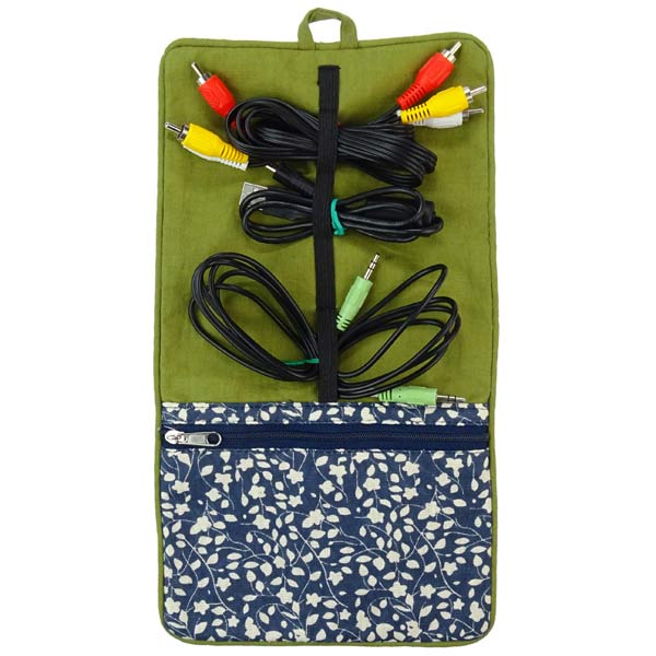 Nie wieder Kabelsalat verspricht dieser Ordnungshelfer für die Reise oder zu Hause. Maß offen: 31x17cm. Innenausstattung: 5 elastische Schlaufen für Kabel, ein Reißverschlusstäschchen für Stecker, Batterien und Zubehör, zusätzlich ausgestattet mit 2 SD Kartenhaltern und einer Schlaufe für den USB-Stick. Außenmaterial: Leinen, Innenfutter Seide. Der Organizer schließt mit einer elastischen Schlaufe. Offen kann der Organizer mit einer Aufhängeschlaufe an die Wand gehängt werden. HINWEIS: wir liefern diesen Artikel leer, ohne die abgebildete Ausstattung.