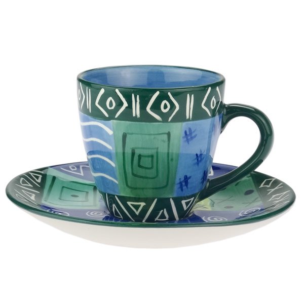 Von Hand gearbeitetes Kaffeegeschirr, Set Obertasse und Untertasse, Tasse mit einem Fassungsvermögen von 200ml. Maß Obertasse: Höhe: ca. 8,5cm, Durchmesser: ca. 8,5cm. Unterteller: Durchmesser ca. 17cm.Unterglasur Design: handbemalt. Es gibt mehrere Varianten innerhalb einer Farbfamilie, gelieferter Artikel kann von der Abbildung abweichen.Material: hochwertiges Steinzeug aus weißem Ton, Glasurbrand bei 1.200°CEigenschaften: mikrowellengeeignet, für Lebensmittel geeignet.Empfehlung: handgemachte Keramik ist stoßempfindlicher als Industriekeramik. Die Standfläche der Keramik ist nicht glasiert. Wir empfehlen die schonende Reinigung durch Handabwasch.