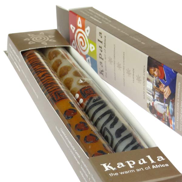 Geschenkbox mit einem Paar Fairtrade Künstlerkerzen aus der südafrikanischen Manufaktur von KAPULA CANDLES. Jede handbemalte Kerze ist ein kleines Unikat, liebevoll und mit vielen Details gearbeitet, in Schutzfolie verpackt. Maß Einzelkerze:2,2x23cmMaterial: hochwertiges ParaffinwachsBrenndauer Einzelkerze: ca. 10 StundenDesign/ Farbe: vielfältige Designs inspiriert von der afrikanischen Tierwelt, gelieferte Artikel können von der Abbildung abweichenSicherheits- und Pflegehinweis: Brennende Kerzen niemals in der Nähe von leicht entflammbaren Gegenständen aufstellen. Zugluft vermeiden, nicht unbeobachtet brennen lassen, nicht in Reichweite von Kindern und Tieren aufstellen. Kerze senkrecht und sicher aufstellen.Docht regelmäßig einkürzen (ca. 10-15mm) um ein Rußen zu vermeiden.
