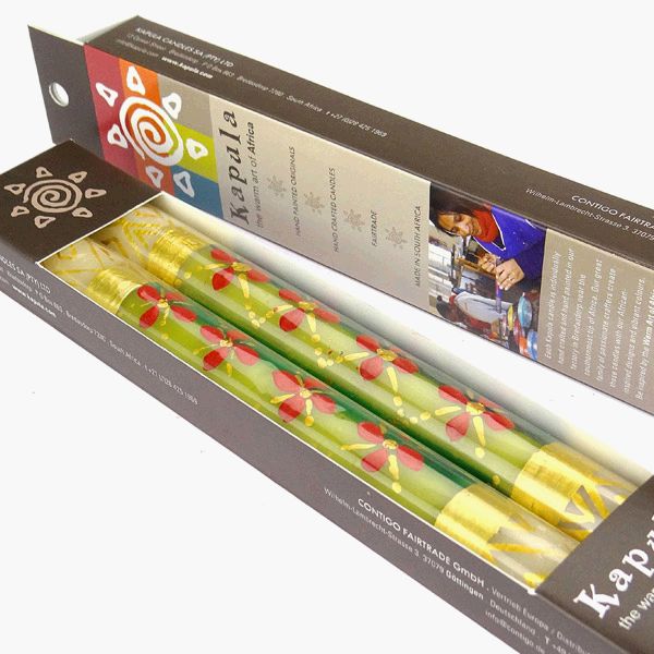Geschenkbox mit einem Paar Fairtrade Künstlerkerzen aus der südafrikanischen Manufaktur von KAPULA CANDLES. Jede handbemalte Kerze ist ein kleines Unikat, liebevoll und mit vielen Details gearbeitet, in Schutzfolie verpackt.