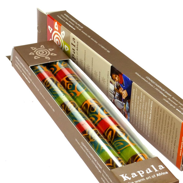Geschenkbox mit einem Paar Fairtrade Künstlerkerzen aus der südafrikanischen Manufaktur von KAPULA CANDLES. Jede handbemalte Kerze ist ein kleines Unikat, liebevoll und mit vielen Details gearbeitet, in Schutzfolie verpackt. Maß Einzelkerze:2,2x23cmMaterial: hochwertiges ParaffinwachsBrenndauer Einzelkerze: ca. 10 StundenDesign/ Farbe: vielfältige Designs in warmen Savannenfarben, gelieferte Artikel können von der Abbildung abweichenSicherheits- und Pflegehinweis: Brennende Kerzen niemals in der Nähe von leicht entflammbaren Gegenständen aufstellen. Zugluft vermeiden, nicht unbeobachtet brennen lassen, nicht in Reichweite von Kindern und Tieren aufstellen. Kerze senkrecht und sicher aufstellen.Docht regelmäßig einkürzen (ca. 10-15mm) um ein Rußen zu vermeiden.