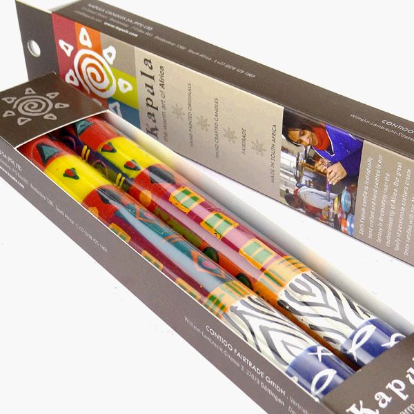 Geschenkbox mit einem Paar Fairtrade Künstlerkerzen aus der südafrikanischen Manufaktur von KAPULA CANDLES. Jede handbemalte Kerze ist ein kleines Unikat, liebevoll und mit vielen Details gearbeitet, in Schutzfolie verpackt. Maß Einzelkerze:2,2x23cmMaterial: hochwertiges ParaffinwachsBrenndauer Einzelkerze: ca. 10 StundenDesign/ Farbe: vielfältige Designs in leuchtenden Farben, gelieferte Artikel können von der Abbildung abweichenSicherheits- und Pflegehinweis: Brennende Kerzen niemals in der Nähe von leicht entflammbaren Gegenständen aufstellen. Zugluft vermeiden, nicht unbeobachtet brennen lassen, nicht in Reichweite von Kindern und Tieren aufstellen. Kerze senkrecht und sicher aufstellen.Docht regelmäßig einkürzen (ca. 10-15mm) um ein Rußen zu vermeiden.