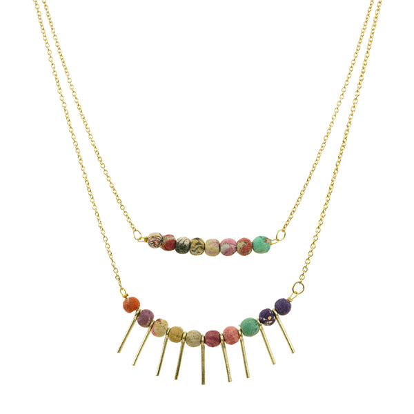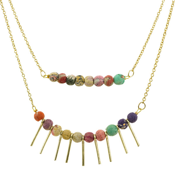 Außergewöhnliche Kette aus bunten recycelten Sari-Stoffen. In aufwendiger Handarbeit werden Holzkugeln aus Holzabschnitten mit recycelten, zuvor gewaschenen Sari-Stoffen umwickelt und mit Messingelementen kombiniert. Durch die Auswahl der Stoffe wird jedes Schmuckstück zu einem Unikat.