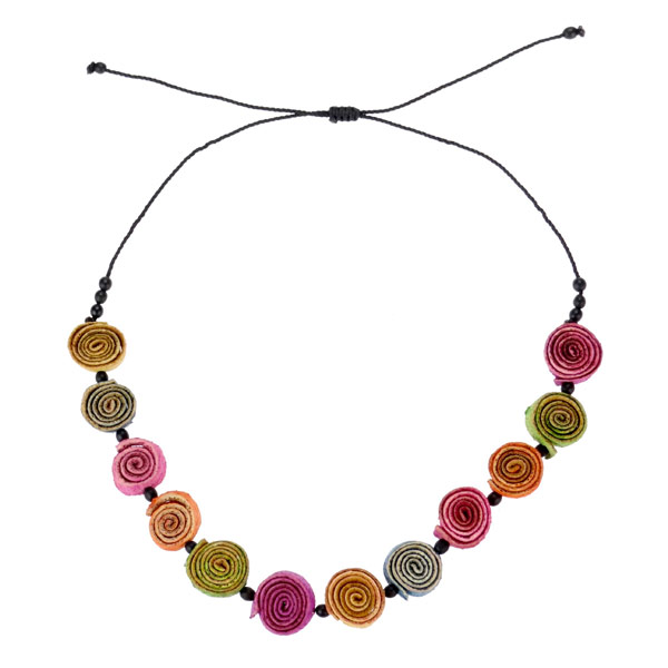 Kette mit gedrehten Spiralen aus getrockneter Orangenschale sowie schwarzen Chirilla-Perlen, Umfang verstellbar von ca. 40 - 70cm. Da es sich um Handarbeit und Naturmaterialien handelt, können Farben und Formen von der Abbildung abweichen. ACHTUNG: Die Textilfarben können bei Feuchtigkeit abfärben. Bitte den Schmuck vor Nässe schützen.