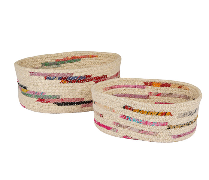 Dieser praktische Aufbewahrungskorb aus Jute und recyceltem Sari-Stoffen bietet eine tolle Kombination aus Nachhaltigkeit und Design.