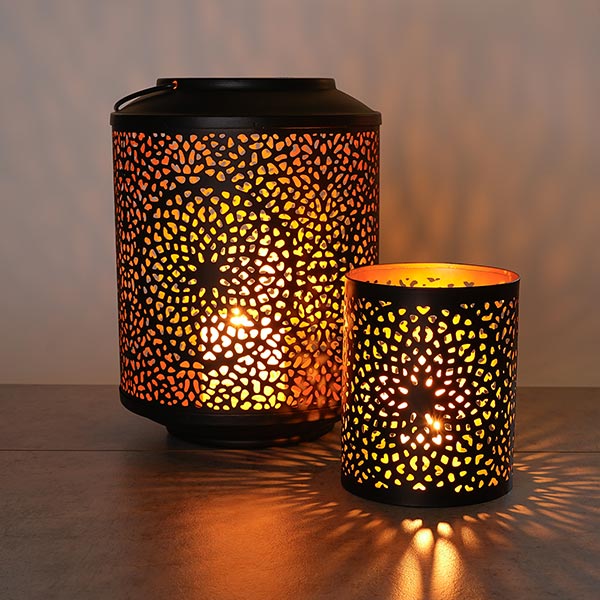 Ob für eine kuschelig warme Atmosphäre im Haus oder an lauen Sommernächten als romantische Lichtquelle für Balkon und Terrasse. Zauberhafte Lichtwirkung und Farbspiel durch das filigran durchbrochene Dekor im Metall, das in einem Ätzverfahren herausgearbeitet wird.