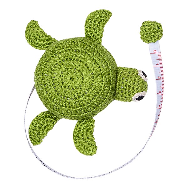 Fantasievoller kleiner Helfer im Haushalt und bei Handarbeiten. Die Schildkröte hat ein Rollband im Inneren, das sich durch Zug an dem Häkelende ausziehen lässt. Zum Einrollen mit Daumen und Zeigefinger den Körper zusammendrücken.
