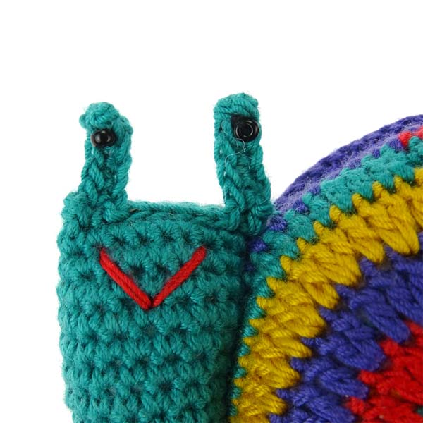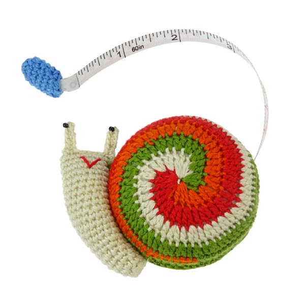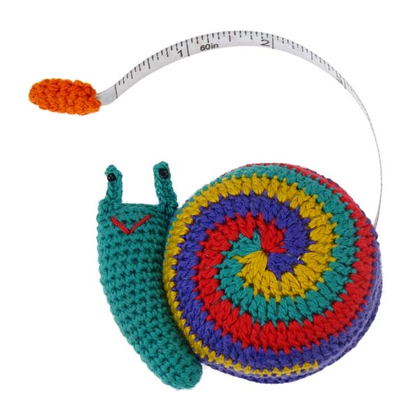 Fantasievoller kleiner Helfer im Haushalt und bei Handarbeiten. Die Schnecke hat ein Rollband im Inneren, das sich durch Zug an dem Häkelende ausziehen lässt. Zum Einrollen mit Daumen und Zeigefinger den Körper zusammendrücken.