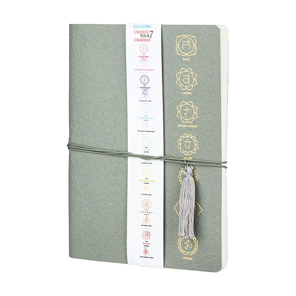 Hochwertiges Notizbuch mit allen 7 Chakren für Memos, Skizzen und Gedanken aus handgeschöpftem Recyclingpapier mit Wickelband.