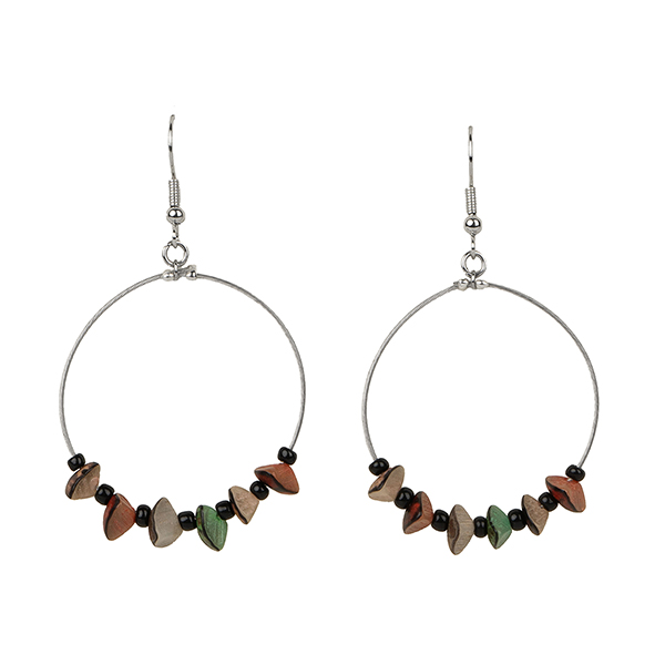 Herbstlich-natürliche Ohrringe mit schwarzen Glasperlchen und Nuss Stückchen (Bits) aus den Samen der philippinischen Buri-Palme.