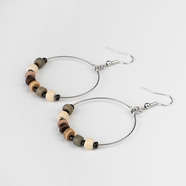Material: Kokospalme (Cocos nucifera); nickelfreie Metallteile, Glasperlchen, Silikonstopper