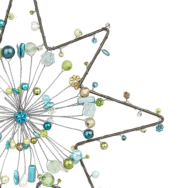 Festliche, reichlich verzierte Sterndekoration mit großem Kristall von unserem Partner Almeerath aus Ägypten. Die aus Draht geformten Sterne, Engel, Rentiere usw. werden aufwendig von Hand mit Perlen und kleinen Anhängern aus Glas und Kunststoff verziert. Als Fenster-, Raumdekoration oder zum Verzieren von Geschenken geeignet.
