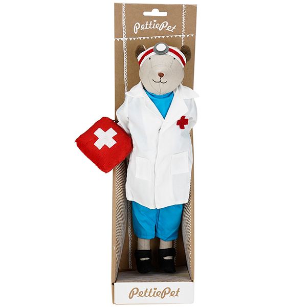 Allzeit bereit und immer mit einem Lächeln auf den Lippen: tut mal etwas weh, ist Doktor Fröhlich gleich tröstend zur Stelle. Der niedliche Bär ist ein treuer Begleiter zum Kuscheln und Spielen. Für die PettiePets gibt es eine Vielzahl an Kleidersets, die allen Tierchen passen und sogar miteinander kombiniert werden können. Das Ein-, An- und Verkleiden macht nicht nur uns Spaß, sondern fördert auch die kindliche Motorik und Fantasie. Unsere PettiePets entstehen in liebevoller Handarbeit in Chiang Mai, Thailand.