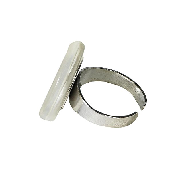 Material: Capizmuschel (Placuna placenta) mit Kunstharz überzogen; Ring aus Edelstahl, nickelfrei