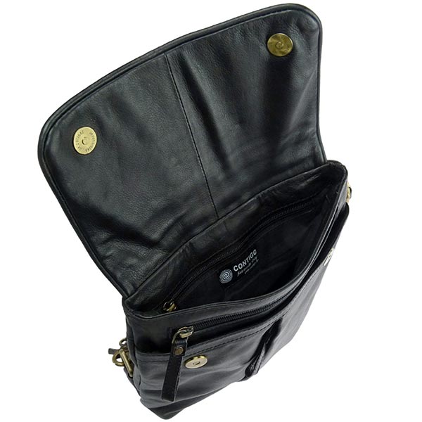 Reißverschlussfach auf Rückseite. Unter der Klappe: Offenes Fach. Das Hauptfach verfügt über ein Reißverschlussfach und ein Handyfach. Schultergurte stufenlos verstellbar (90-110 cm); teilbar, dadurch ein- oder beidseitig tragbar.