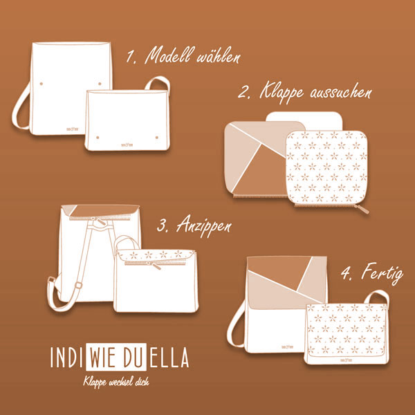 Jeden Tag die Tasche wechseln, damit sie zum Outfit passt - mit unserer Kollektion IndiWIEDUella ist das möglich. Dieser elegant geschnittene Rucksack aus hochwertigem Rindsleder ist ein Verwandlungskünstler. Kombiniert mit einer Klappe zum Auswechseln, passt sich das gute Stück dem individuellen Look des Tages an. Das Grundmodell kommt schlicht ohne Klappe. Diese kann selbst gewählt werden. Unsere große Auswahl an Wechselklappen sorgt für das modische Extra. Ob im Patchwork Look, gestanzt, geprägt oder farbig abgesetzt, jede Wechselklappe kann mit einem Reißverschluss einfach abgenommen und ausgetauscht werden.