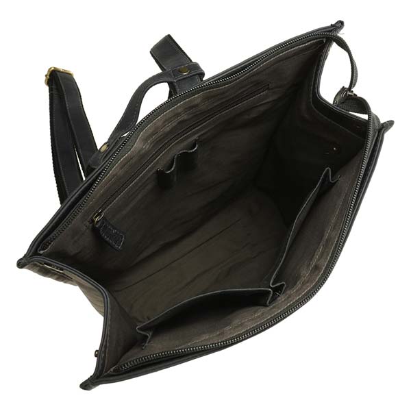 Innen: Innenraum sicher verschließbar, graues Canvasfutter, 2 offene Fächer (Handy geeignet), 1 Reißverschlussfach mit aufgesetzten Stifteschlaufen.