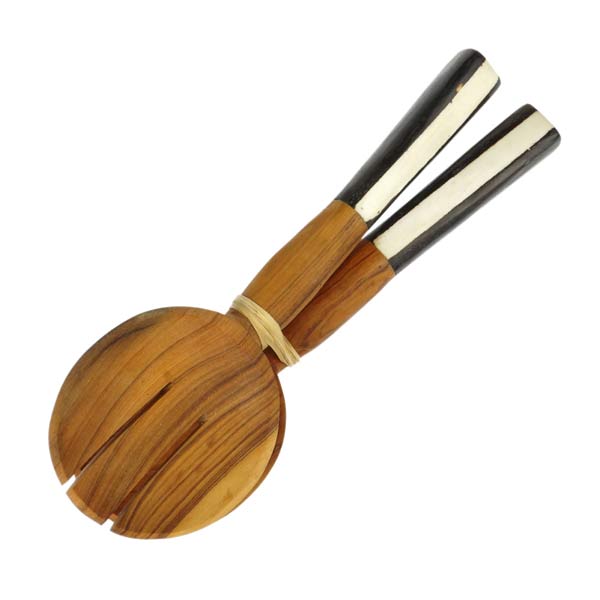 Ein Hingucker am Salatbuffet: Dieses von Hand gefertigte Salatbesteck aus Olivenholz überzeugt durch seine natürlichen Maserungen.