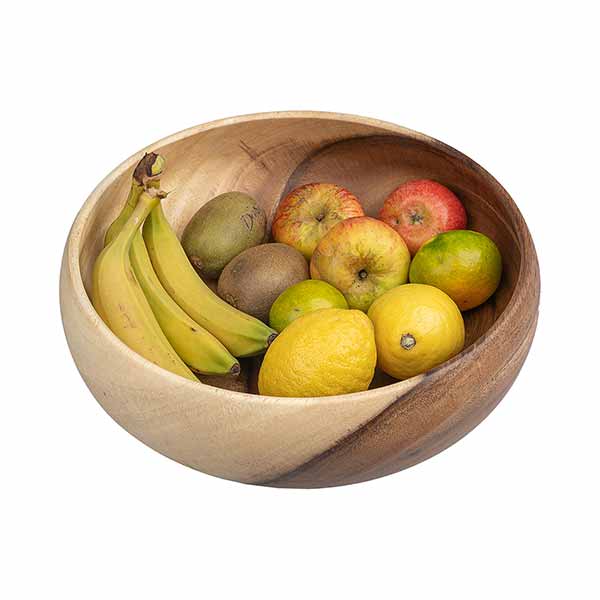 Formschön geschwungene Holzschale mit breitem Rand und flachem Fuß. Für alle, die den Landhausstil lieben, gehört dieses Stück auf den festlich gedeckten Tisch. Wunderbar geeignet als Obst-, Salat- oder Servierschale.