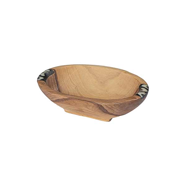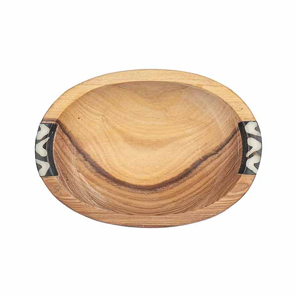 Material: Olivenholz (bot. Olea africana, black olive wood) geölt (Speiseöl), Einlagearbeit aus Knochenmaterial (Ziege) mit Pottasche gebatikt