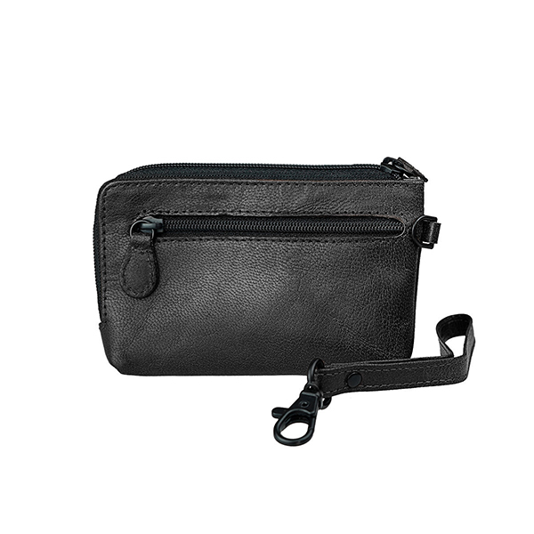 Gepolstertes Hauptfach mit Kette und zwei Schlüsselringen. Reißverschlussfach vorn und hinten. Lasche mit Karabiner außen.