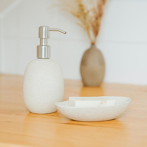 Seifenspender für Flüssigseife mit langlebiger Edelstahlpumpe. Ein dezenter Blickfang im Badezimmer oder neben der Küchenspüle.