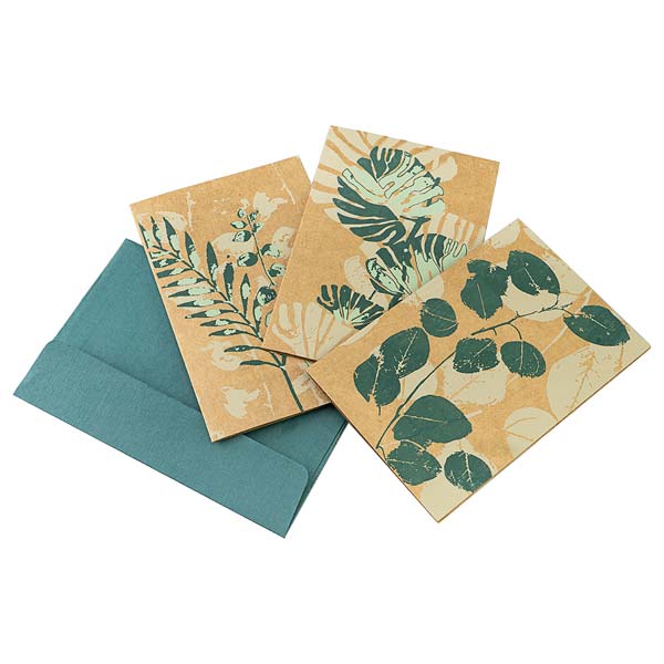 Diese besonderen Grußkarten werden von unserem Handelspartner Seet Kamal in Indien im Siebdruckverfahren verziert. Jedes Set enthält drei schmuckvolle Blattdesigns und Umschläge in einem warmen Grünton. Die Schreibeinlage ist naturweiß.