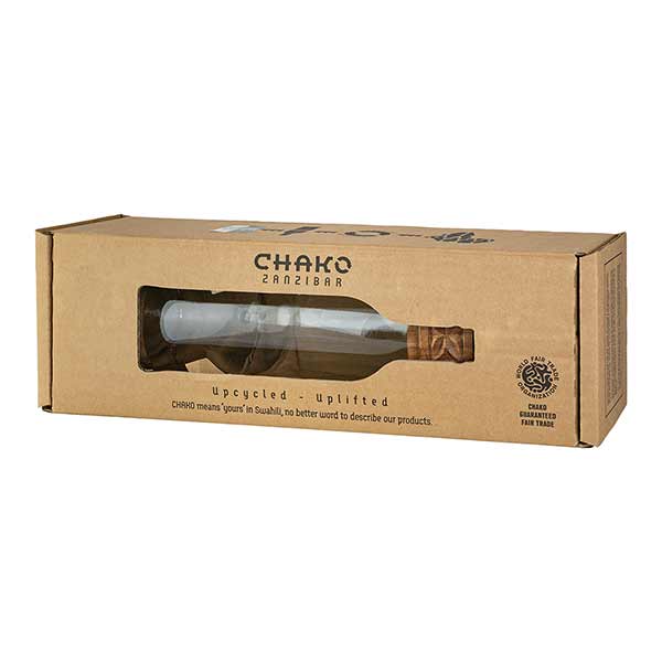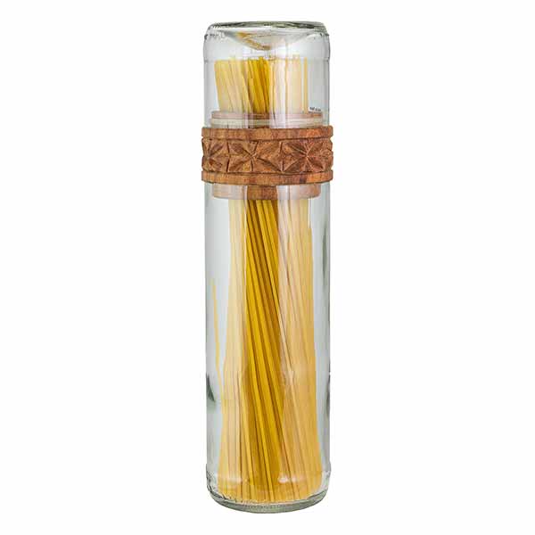 Praktisches Vorratsglas für Spaghetti inklusive Dichtungsring hergestellt aus recycelter Weinflasche, handgefertigt auf der in Insel Sansibar, Tansania.