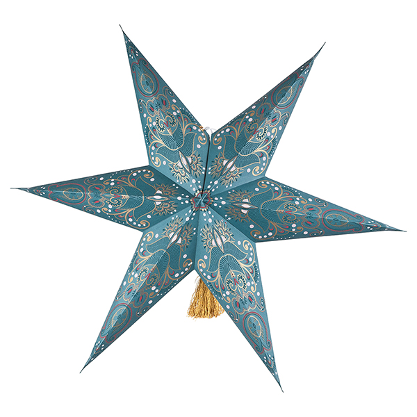 Papierstern mit einem wunderbar üppigen Dekor. Ein auffälliger übergroßer Raumschmuck mit orientalischem Flair. Dekorieren Sie den Stern im weihnachtlichen Fenster oder hängend unter der Zimmerdecke.