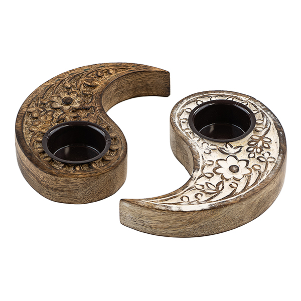 Dieser besondere Kerzenhalter für Teelichte aus Mangoholz, von Hand verziert mit kunstvollen Schnitzereien, passt wunderbar zu einem natürlichen Einrichtungsstil, zu Boho oder Shabbi Chic.