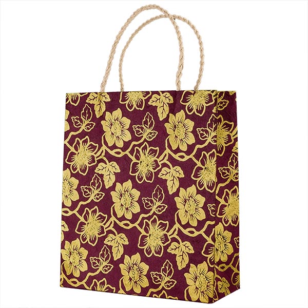 Festliche Tragetasche aus handgeschöpftem Loktapapier, im Siebdruck-Verfahren bedruckt. Lokta, die Rindenfaser des Seidelbastes, wird im Himalaya von Dorfgemeinschaften geerntet und in kleinen Papiermanufakturen nach alter Tradition zu Papier verarbeitet. Loktapapier hat eine besonders weiche, stoffähnliche Haptik. Das Naturpapier kann mit verschiedensten Techniken gefärbt und gestaltet werden.