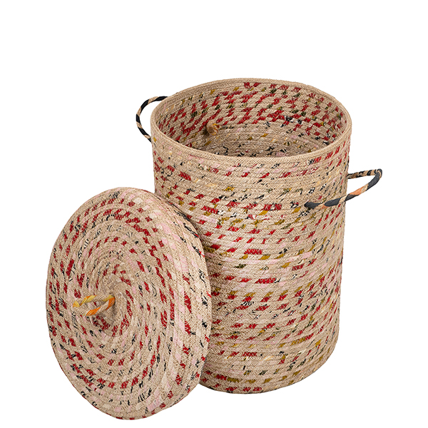 Zylindrischer Wäschekorb aus Jute mit recycelten Sari-Stoffen. Die Körbe von Dhaka werden in Bangladesh handgefertigt und werden mit jahrelanger Erfahrung von überwiegend weiblichen Handwerkenden in liebevoller Arbeit geflochten. Somit bietet das Korbflechten ein sehr wichtiges, verlässliches Einkommen, welches es den Frauen ermöglicht, ihre Familien zu unterstützen und unabhängig zu sein.
