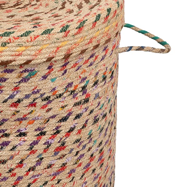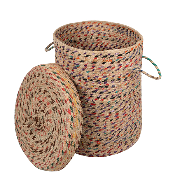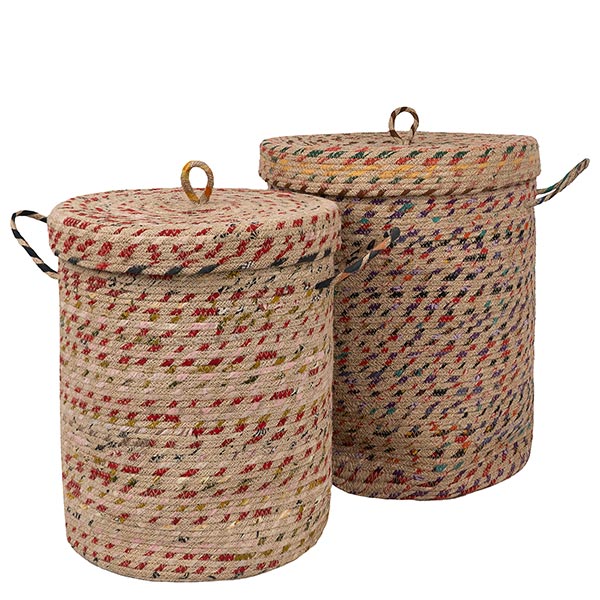 Zylindrischer Wäschekorb aus Jute mit recycelten Sari-Stoffen. Die Körbe von Dhaka Handicraft werden in Bangladesch handgefertigt und von überwiegend weiblichen Handwerkenden mit jahrelanger Erfahrung in liebevoller Arbeit geflochten. Das Korbflechten bietet ein sehr wichtiges, verlässliches Einkommen, das den Frauen ermöglicht, ihre Familien zu unterstützen und unabhängig zu sein.