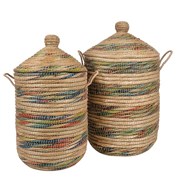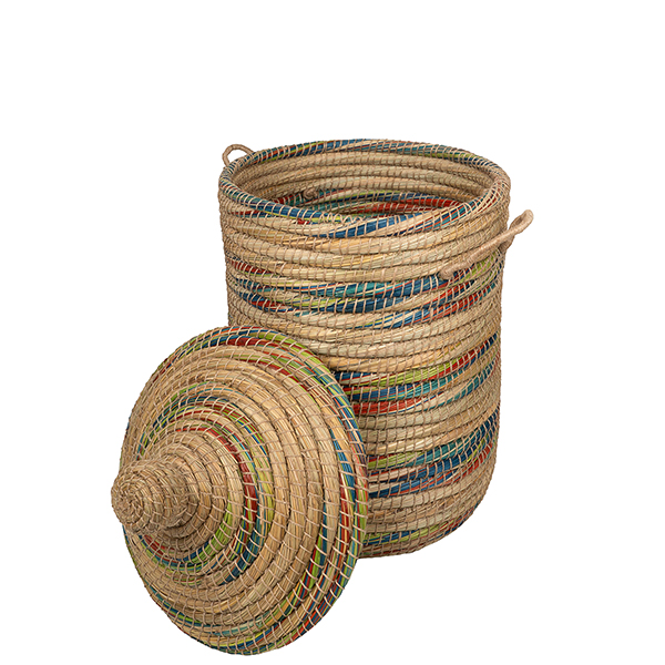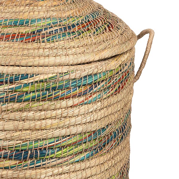 Einzigartiger Wäschekorb aus natürlichen Kaisagras in einem farbenfrohen Design. Die Körbe von Dhaka werden in Bangladesh handgefertigt und mit jahrelanger Erfahrung von überwiegend weiblichen Handwerkenden in liebevoller Handarbeit geflochten. Somit bietet das Korbflechten ein sehr wichtiges, verlässliches Einkommen, welches es den Frauen ermöglicht, ihre Familien zu unterstützen und unabhängig zu sein.