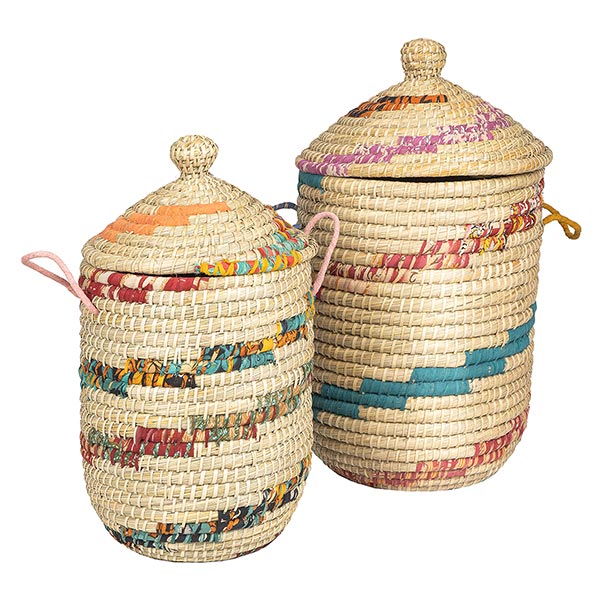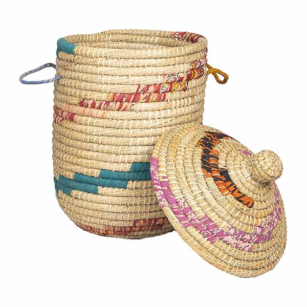Dieser dekorative Wäschekorb aus natürlichem Kaisagras mit recycelten Sari-Stoffen bietet die perfekte Kombination aus Nachhaltigkeit und Design. Die Körbe von Dhaka werden in Bangladesh handgefertigt und werden mit jahrelanger Erfahrung von überwiegend weiblichen Handwerkenden in liebevoller Arbeit geflochten. Somit bietet das Korbflechten ein sehr wichtiges, verlässliches Einkommen, welches es den Frauen ermöglicht, ihre Familien zu unterstützen und unabhängig zu sein.