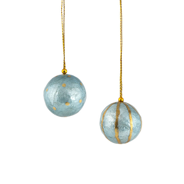 In Handarbeit gefertigte Kugeln aus Capizmuscheln, im eleganten Eisblau. Mit ihrem goldenen Bändchen lassen sie sich an jeden Christbaum oder festlichen Zweig hängen. Sie eignen sich auch perfekt zum Dekorieren eines Geschenks oder Adventskranzes.