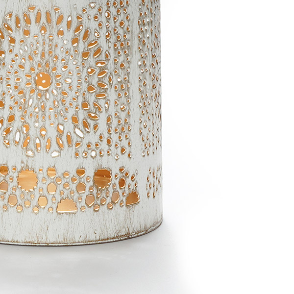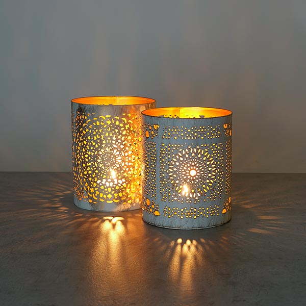 Handgearbeitetes Windlicht aus einer Werkstatt im indischen Moradabad, für stimmungsvolle Abende in Haus und Garten. Es entsteht eine zauberhafte Lichtwirkung durch das filigran durchbrochene Metalldekor. Das in einem Ätzverfahren herausgearbeitete Windlicht besticht durch einen gebürsteten Antik-Look.