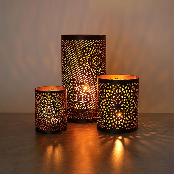 Dieses handgearbeitete Windlicht aus einer Werkstatt im indischen Moradabad verspricht eine stimmungsvolle Beleuchtung.