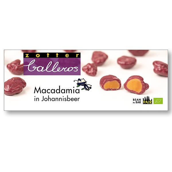 Die Königin der Nüsse, die buttrig-süße Macadamia, ganz frisch geröstet und in lila Johannisbeerkuvertüre gerollt, deren tolle Farbe und fantastischer Geschmack allein aus Beeren entstehen. Außen fruchtig-frisch und innen buttrig-nussiger Knabbertraum.
