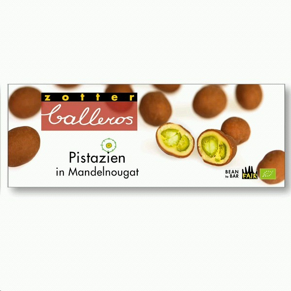Sattgrüne Pistazien umhüllt von selbst gemachtem Mandelnougat mit wunderbarem Schmelz. Bestäubt mit hellem Kakaopulver. Ein Geschmackskunstwerk, das man langsam genießen sollte, denn in jedem kleinen ballero stecken drei ganz unterschiedliche Geschmacksdimensionen.