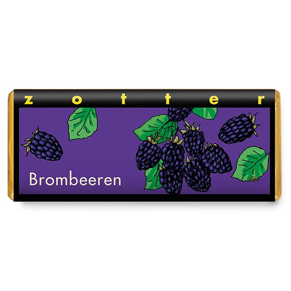 Das Beerenfest: Die üppig prallen Brombeeren,die sich sonst mit vielen Stacheln wehren, endlich gezähmt in einer zartschmelzenden dunkelvioletten Brombeerganache, die mit einem Spritzer Zitroneverfeinert wird. Oben und unten mit einer hauchdünnen weißen Schokoschichtgerahmt und mit Milchschokolade mit 40 % Kakaoanteil überzogen.