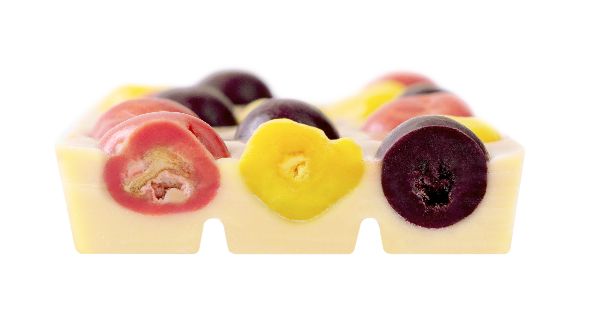 Weiße Schokolade aufgepeppt mit erfrischender Zitronenkuvertüre, punktet mit knusprig-bunten Schokofruchtkugeln in drei verschiedenen Sorten: Erdbeeren in rosaroter Erdbeerkuvertüre, Maracujastückchen in sonnengelber Maracujakuvertüre und Heidelbeeren in dunkelblauer Heidelbeerkuvertüre. Die bunten Farben entstehen ganz natürlich nur aus Früchten und Beeren. Süß, erfrischend zitronig, mit Fruchttupfen.